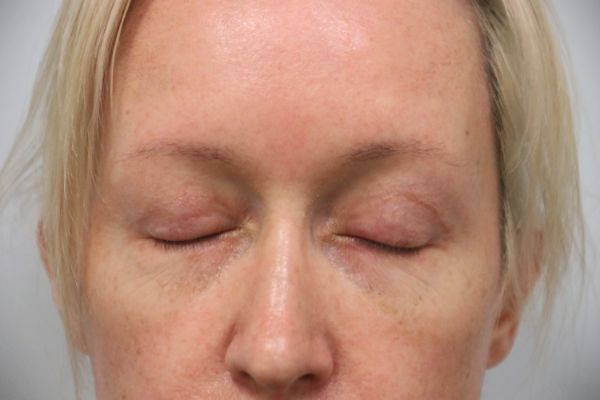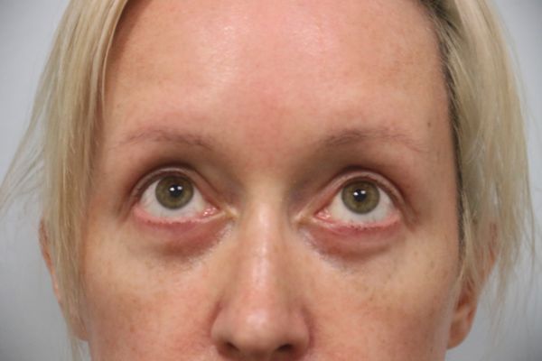 This patient in her mid 40s has been bothered by the tired appearance of her eyes. She really noticed in the last few years the eye bags really enlarged. In the before photo you can see how full the lower eyelids appeared from fat in the area. You can also see how the right eyelid was sagging more than the left for the upper eyelids. In the after photos you can see how much improvement she had and how her eyes look more awake. She is three months post surgery in the after photos.