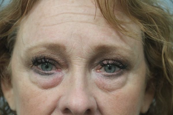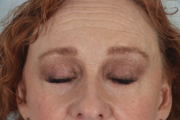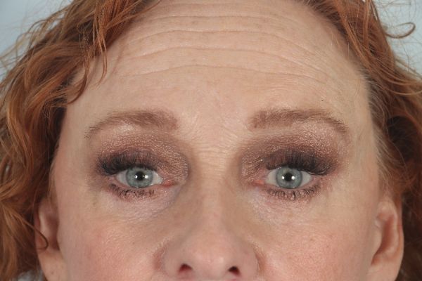 This patient in her later 60s was bothered by her jowls and sagging neck as well as the area around her eyes. She underwent a lower facelift involving the neck and cheek with a platysmal myectomy, temporal brow lift to help raise the outer corners of the brows, and an upper and lower blepharoplasty. In the after photos you can see how her skin looks more youthful, the sags are gone, and her eyes look more awake and inviting.