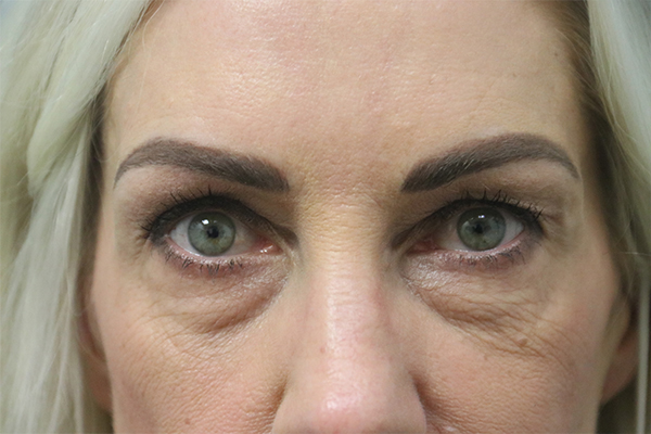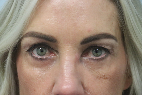 This patient in her mid 50s was bothered by her lower eyelid fat pads. In addition, she was diagnosed with a skin cancer near the inner corner of her upper eyelid when she consulted with Dr. Guy. She underwent Mohs’ surgical excision of her cancer by a Mohs’ surgeon and then reconstruction and lower blepharoplasty with Dr. Guy. In the after photo you can see how much improvement she had and her cancer reconstruction you can barely see.
