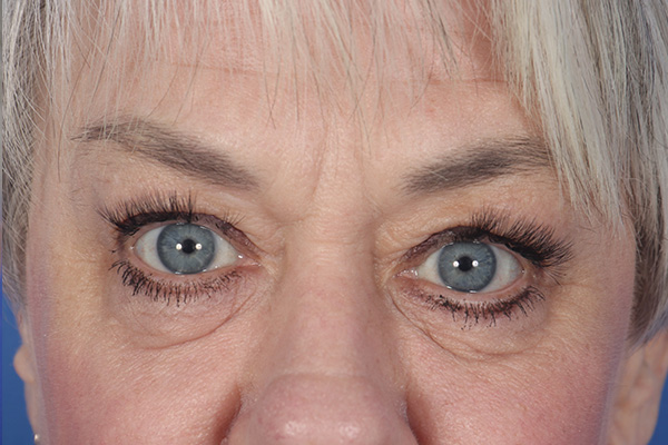 This patient in her 60s was bothered by her lower eyelids. On the right she had a different condition that normally seen with lower eyelids, called a festoon. This is essentially redundancy of the eyelid muscle. This is not approached in the same way as a traditional lower eyelid surgery. This requires a direct excision of the redundancy so as not to pull the eyelid down. In the after photo you can see how much improvement she has had. What you may not realize is there is an incision located in the tear trough area. For those with larger festoons, this is an excellent approach to eyelid rejuvenation.