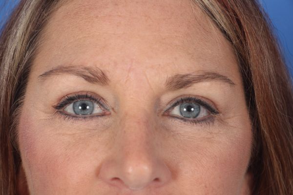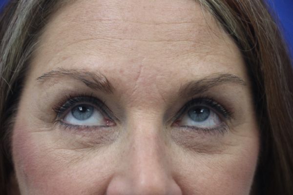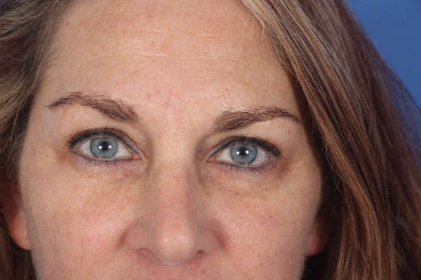This patient in her later 50s underwent an upper blepharoplasty (eyelid lift) and lower blepharoplasty with Dr. Guy. The surgery takes about an hour with almost no discomfort throughout the entire process. The after photo is 6 months after surgery. You can see how much more open her eyes are and you can see the upper eyelid crease. On the lower eyelids the fat pads were contoured to create a better overall appearance.