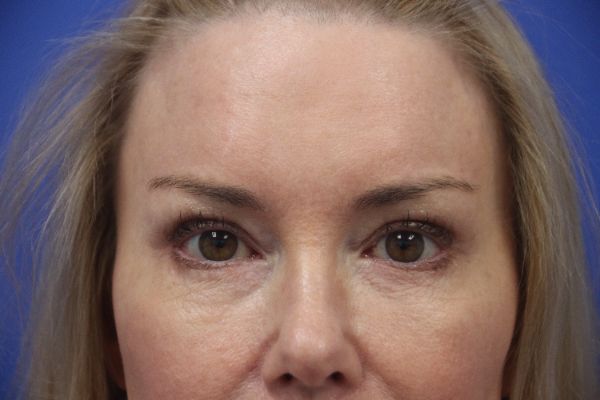 This patient in her later 50s was bothered by the tired appearance around her eyes. She had lower eye bags and brow hooding. Dr. Guy performed a lower blepharoplasty to remove excess skin and fat, and a temporal brow lift. You can see in the after photo 7 months post op how the eye bags are gone and how her upper eyelids look more open. The latter was accomplished not from an upper eyelid surgery but by the brow lift. This is why it is important to distinguish between the need for an upper eyelid surgery or a brow lift to achieve the best cosmetic outcome.