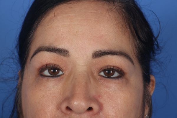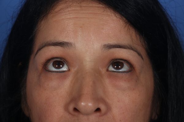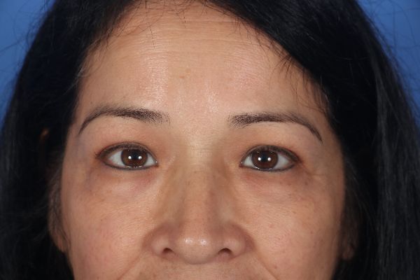 This patient in her mid 40s wanted her eyes refreshed. Dr. Guy performed an upper and lower blepharoplasty (eyelid lift), a surgery that takes him less than an hour. In the after photos notice how the bags below the eyes are gone and you can see her upper eyelid crease now.