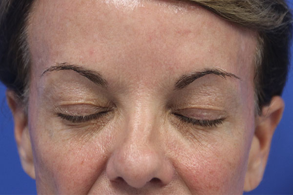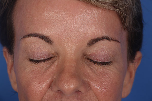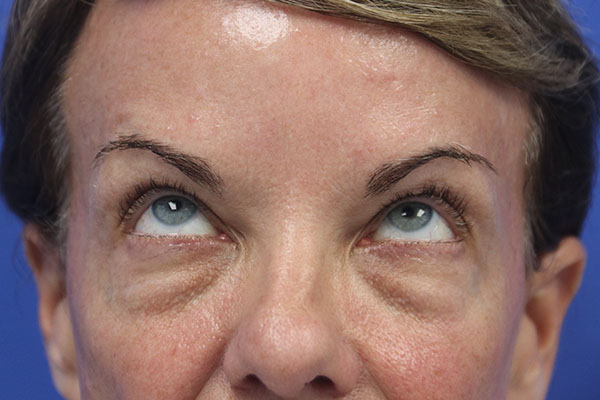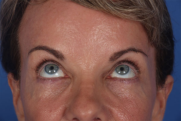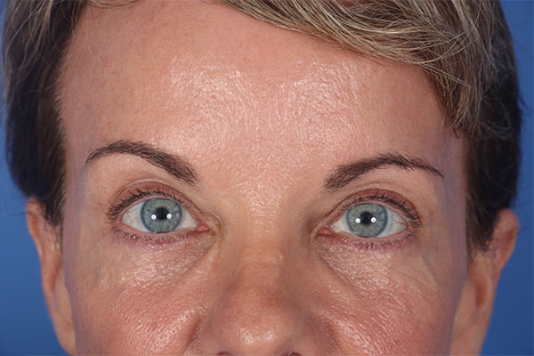 This patient in her mid 50s was bothered by the eye area. Dr. Guy performed an upper and lower blepharoplasty (eyelid lift). In the before photos you can see how the upper eyelid skin is almost touching her eyelashes and the lower eyelid fat is causing a noticeable bulge. In the after photos these conditions are both gone and she looks great.