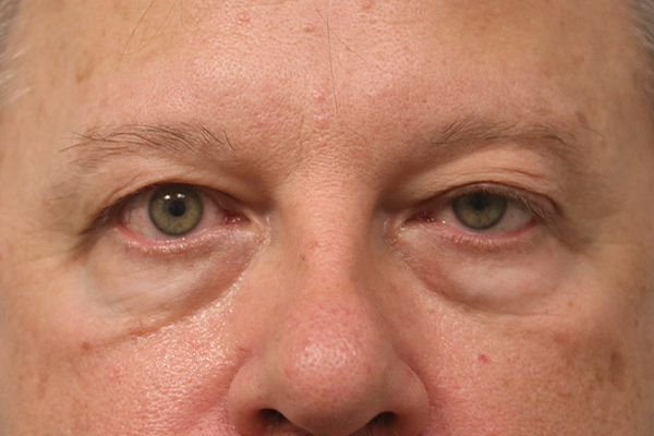 This patient in his mid-50s was bothered by the tired appearance of his eyes. The upper eyelids had skin weighing down his eyes and his lower eyelids had large bags. He underwent a blepharoplasty (eyelid lift) of both the upper and lower eyelids with fat removal. For the lower eyelids, he had a subtarsalexternal incision, yet the scar is essentially imperceptible. Notice in the after photo how natural and refreshed his eyes look. The lower eyelids have a smooth contour and the large bags are gone. The after photo is taken 4 months after his surgery.