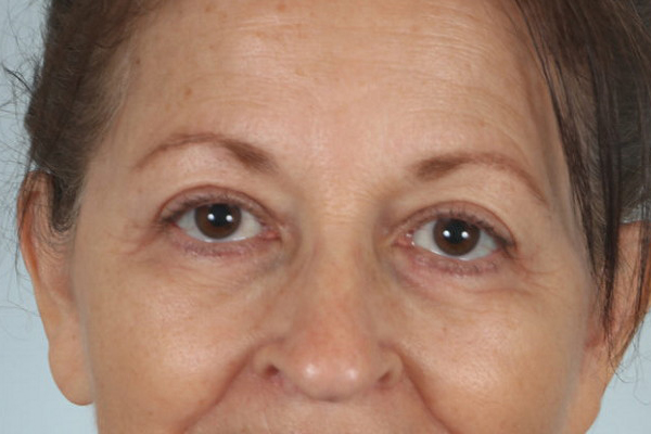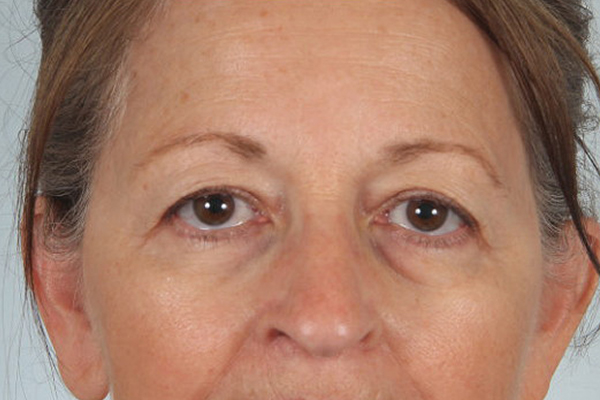 This patient in her later 50s was bothered by her eyelids. The skin on the outside was really weighing her eyelids down creating a sad appearance. She underwent an upper and lower blepharoplasty to remove the fat and excess skin. In the after photo, you can see a much more refreshed and well-rested, natural result.