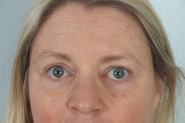 This patient in her 60s was bothered by the tired appearance of her eyes. She had both excess eyelid skin but her brows were also droopy. She underwent an upper and lower eyelid surgery but she also underwent an endoscopic brow lift. In the after photo, you can see how much more open her eyes appear and how much more engaging the area appears. The tired look is also gone.