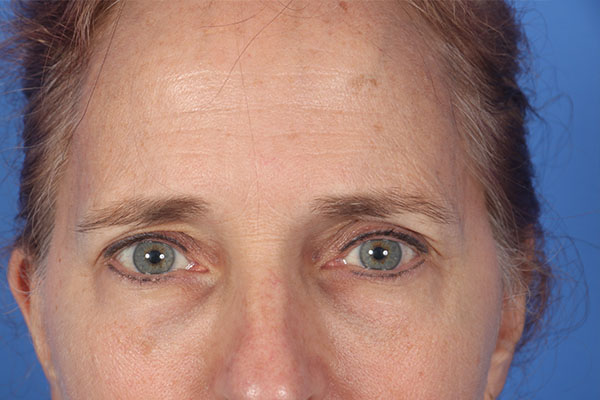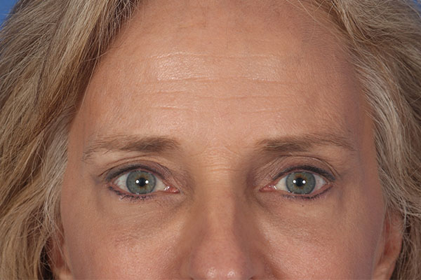 This patient in her late 50s was bothered by her neck, jowls, and heavy brows. Dr. Guy performed a deep plane cheek and neck lift with liposuction of the lateral neck, removal of post platysmal fat, and a platysmaplasty. Additionally, he performed an endoscopic brow lift with small incisions within the hairline. In the after photos taken 8 months post operatively you can see how great her eye area looks. The downturned corners of the brow are up leaving a more approachable and happy appearance. Looking at the eye area you can see how much more open her eyes appear, even though an eyelid lift (blepharoplasty) was not performed. That improvement is a result of her endoscopic brow lift.