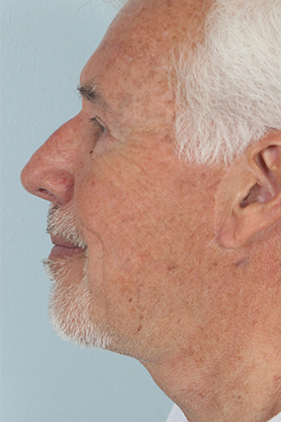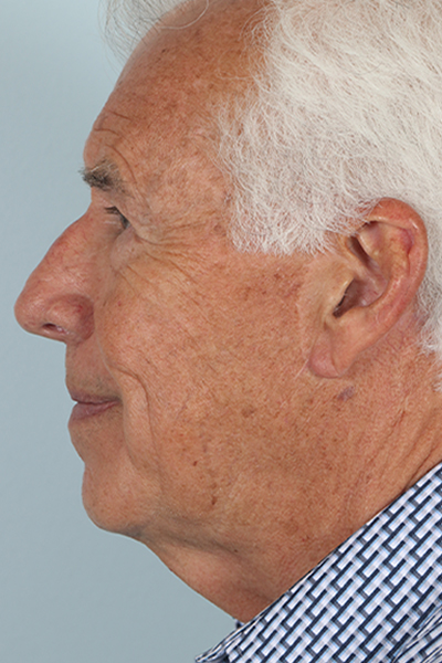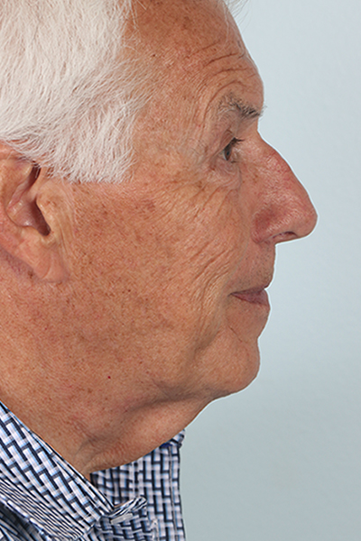 This patient in his 70s had a previous lifestyle lift without much improvement in his neck. He was also bothered by the lower eyelids and the heaviness of his eyebrows. Given the amount of skin laxity present in his neck, a direct neck lift was recommended. You can see in the after photo how all of the hanging skin that used to be in his neck is now gone. For the brows, because he had deeper forehead creases, a mid-forehead lift was also performed. Finally, to address the bags below his eyes a lower eyelid surgery was performed. You can see in the after photos how much more youthful he appears