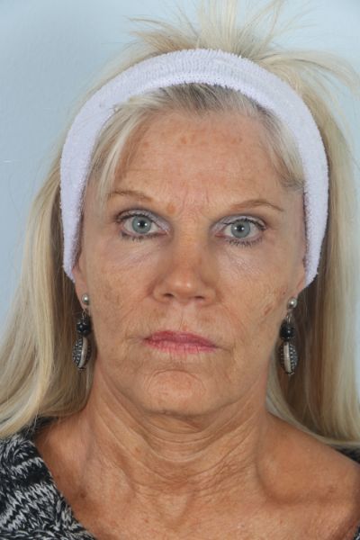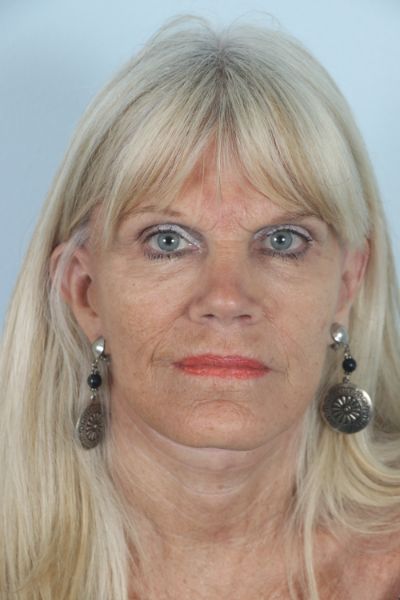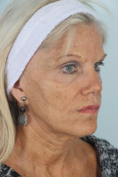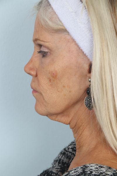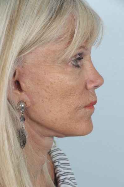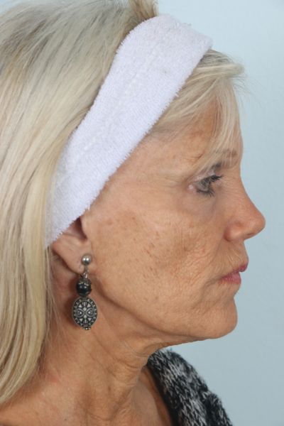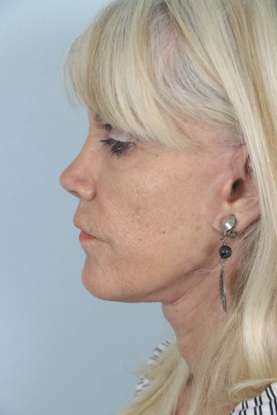 This patient in her mid 60s had a facelift 15 years prior. She noticed a return of her sagging neck and cheek tissues and desired a second lift. We performed a cheek and neck lift (lower facelift) as well as platsymaplasty. In the after photo she is three months out from surgery and you can see how much improvement she has had in the hanging skin of her neck and jowls, especially in the lateral view.