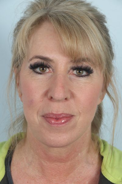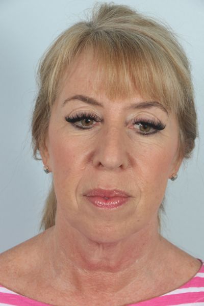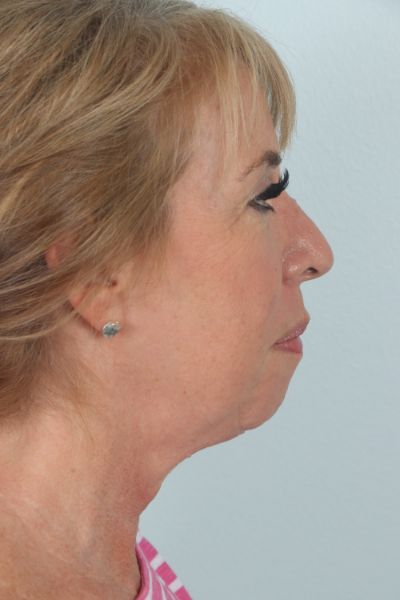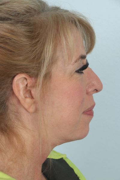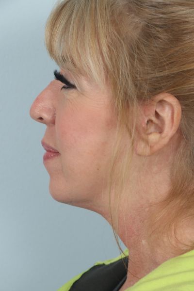 This patient in her mid 50s was bothered by her neck and jowls. She didn’t realize her chin was small which was creating some of her neck problems. This was demonstrated to her at her consultation. She underwent a cheek and neck lift with a platysmaplasty and a chin implant under local anesthesia in the office. In the after photos, taken 3 months after surgery, you can see the better neck line and cheek lines. For her chin it is still feminine but creates a much better balance for the rest of the face.