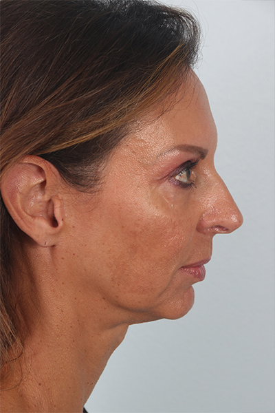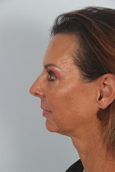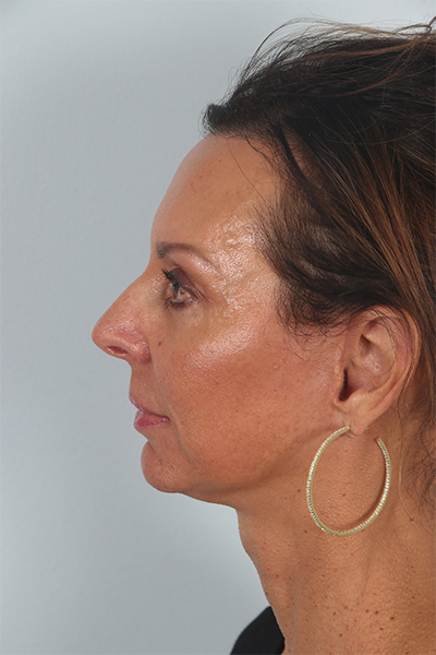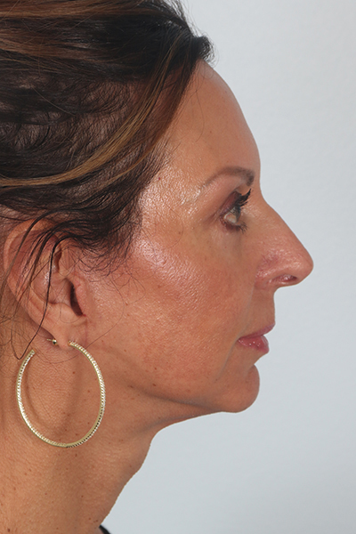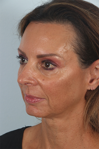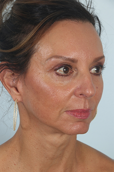 This patient in her mid 50s was bothered by her jowls and lower eyelid fullness. She underwent a cheek lift and lower eyelid surgery. In the after photos you can see how her jawline is smoother and the bags below her eyes are gone.