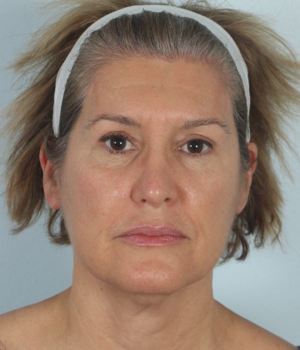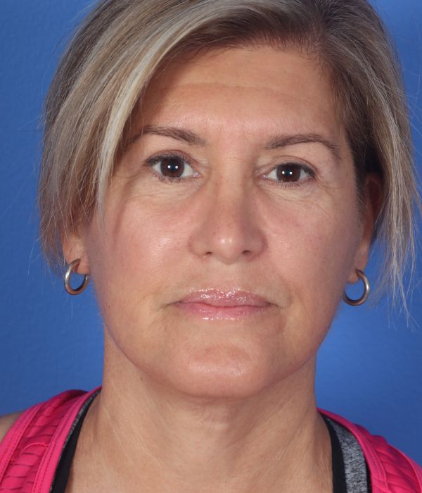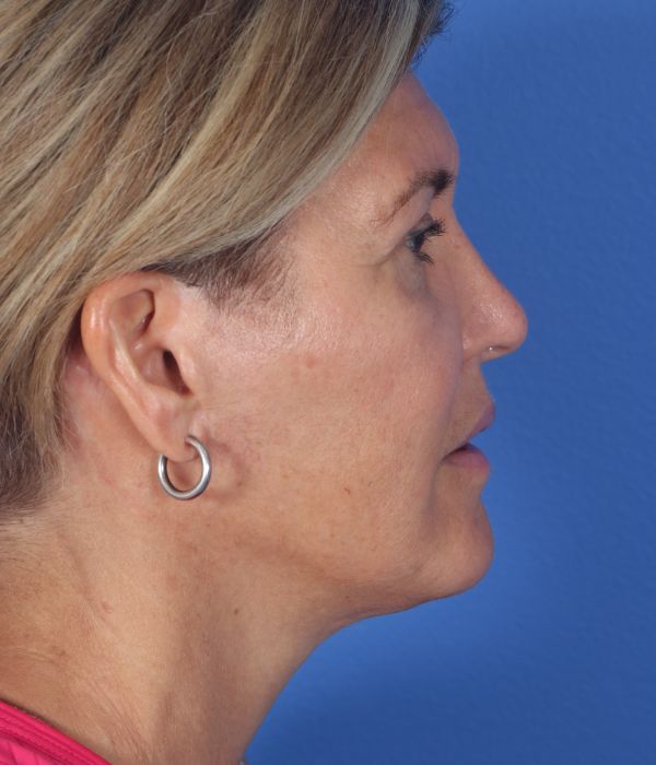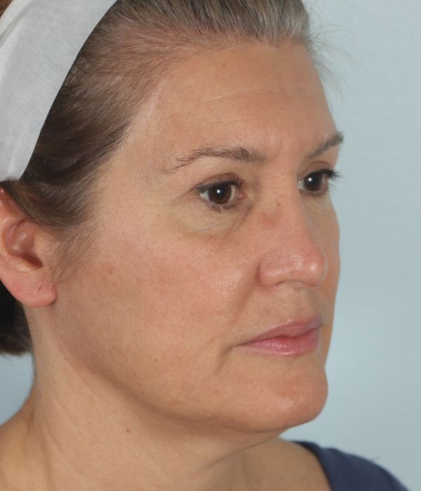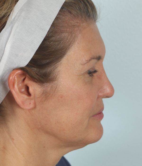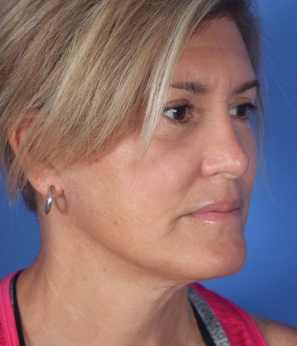 This patient in her 50s was bothered most by her jowls and the laxity in her neck. She underwent a SMAS cheek and neck lift with platysmaplasty in the office under local anesthesia. In the after photo you can see how her jawline is smoother and the fullness below her neck is substantially better.