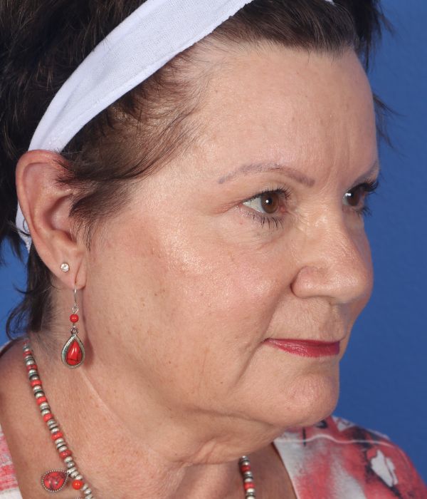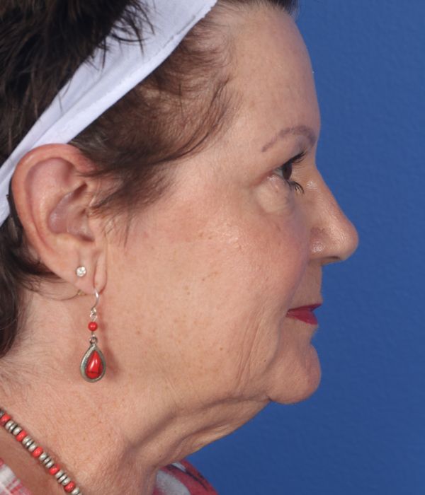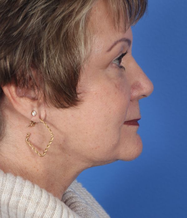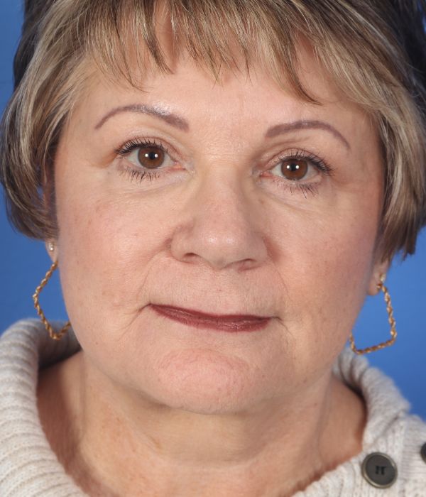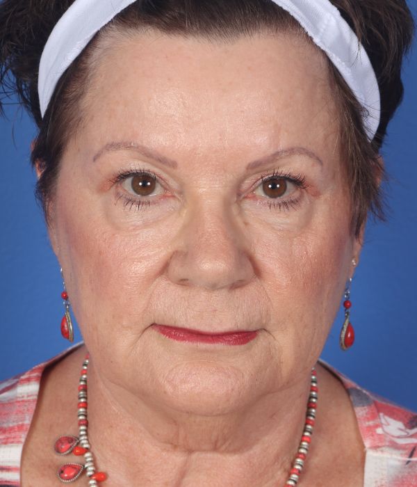 This patient in her late 6os was bothered by how her neck and face aged her. She underwent a deep plane cheek and neck lift with platsymaplasty, liposuction, and upper and lower blepharoplasty. In the after photo you can see how improved her neck and jowls are, how she has a jawline, and how much more youthful she looks. Most importantly she still looks like herself, just a younger version.