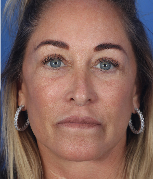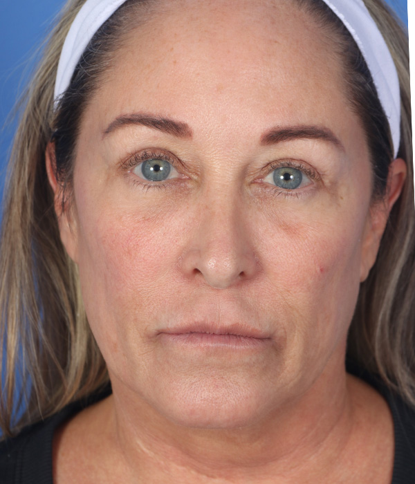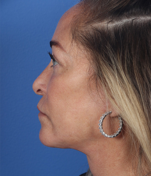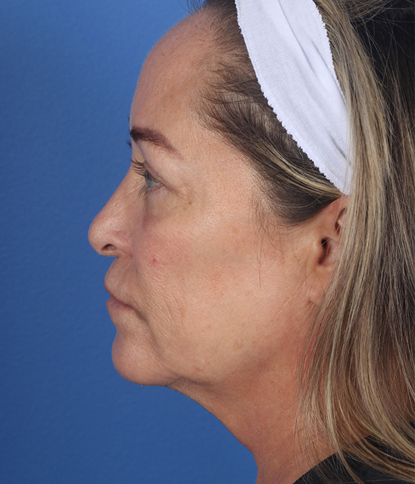 This patient in her 50s was bothered most by her neck and jowls as well as her lower eyelids. Dr. Guy performed a lower blepharoplasty and a deep plane lower facelift. This included liposuction to the lateral neck and a platysmaplasty. In the after photos 8 months post operatively you can see how her neck and jawlines have improved and how her eyes look more awake.