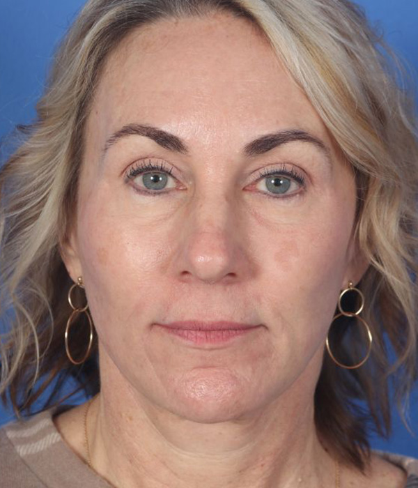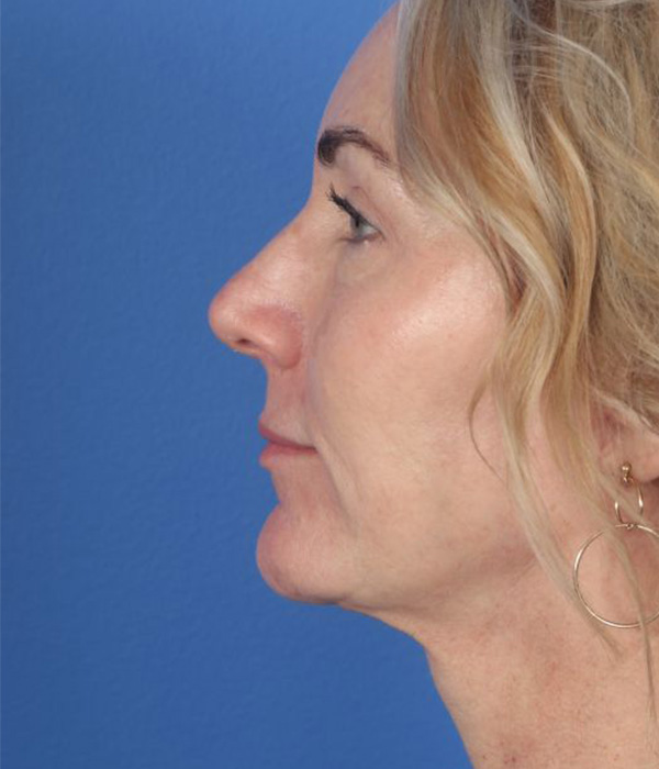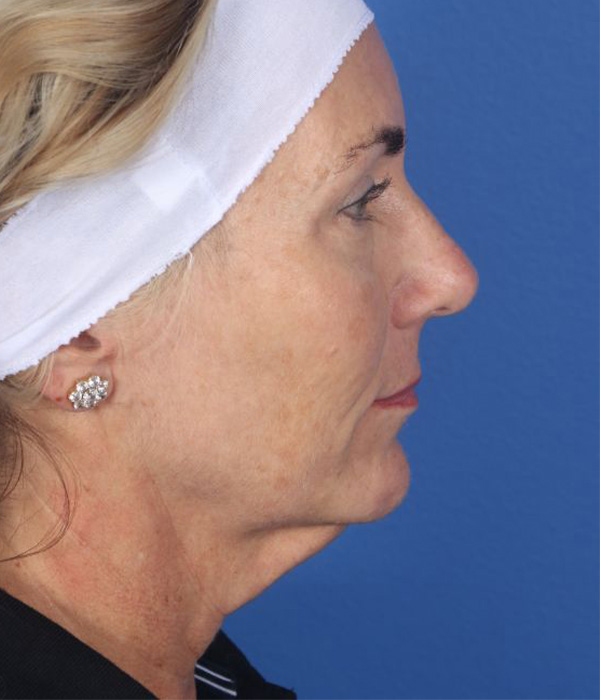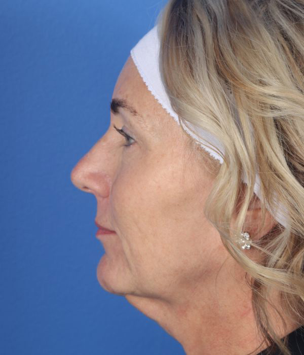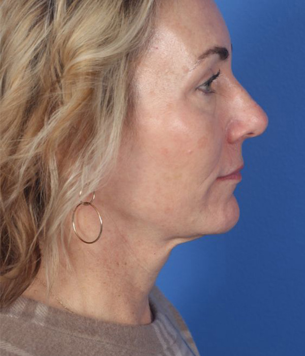This patient in her late 50s was bothered by her heavy neck and jowls. She underwent a deep plane facelift under local anesthesia with Dr. Guy in the office. This included the removal of post platysmal fat to help contour the neck and platysmaplasty to retighten the neck muscles. The deep plane facelift is a power tool to help lift the neck and cheek and maintain a natural appearance. In the after photo you can see the smooth and well defined jawline and neck angle.