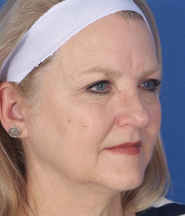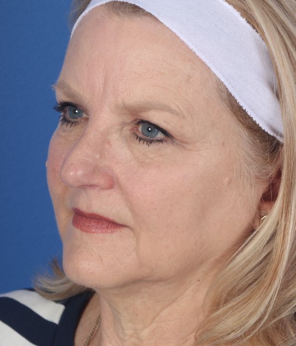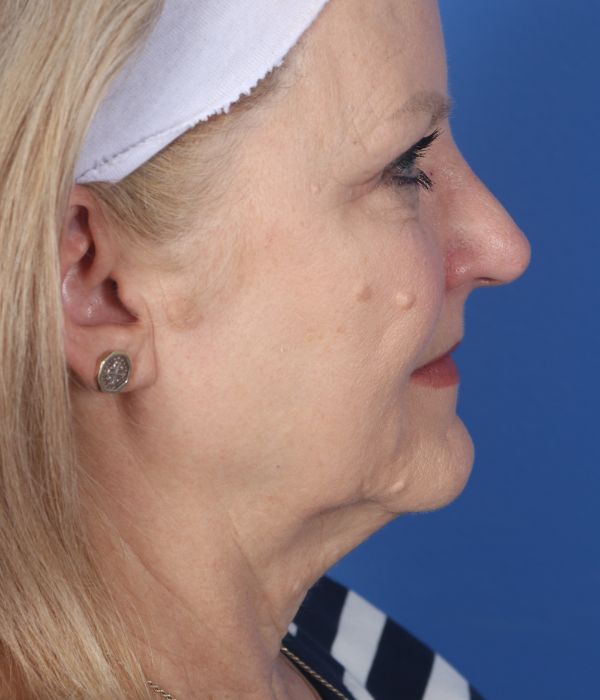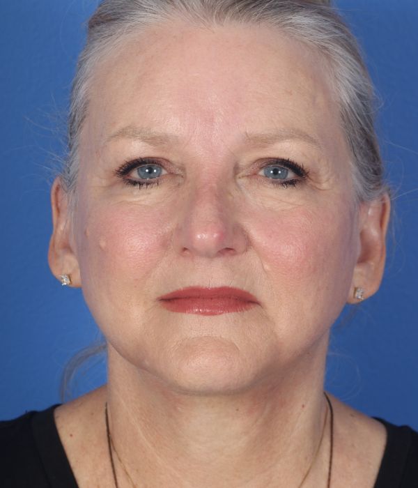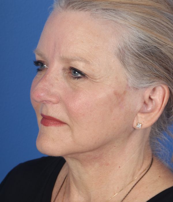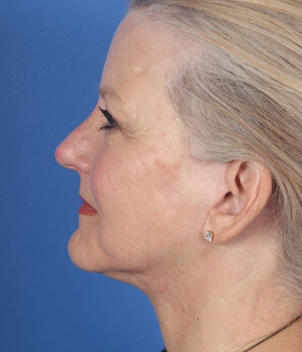 This patient in her mid-60s was bothered by her neck and jowls. Additionally, she felt her brows were heavy. Dr. Guy performed a deep plane cheek and neck lift (lower facelift) including removing deep space neck fat, liposuction to the lateral neck and jowls, and an endoscopic brow lift to help raise up her brows. In the after photo taken almost 6 months post operatively you can see how much improvement she has had yet retains a completely natural appearance.