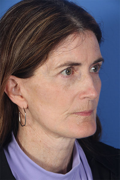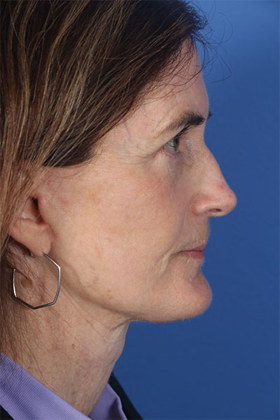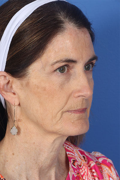 This patient in her early 60s was bothered most by her profile including her neck and jowls. She also felt her lower eyelids looked tired and her skin was not its best. Dr. Guy performed a deep plane cheek and neck lift with platysmal myectomy, platysmaplasty, buccal fat removal, lower blepharoplasty, and fractionated CO2 laser around her mouth. In her after photos you can see how her jaw line is snatched, her neck is tight but not overdone, her eyes look more awake, and the lines around her mouth are improved.