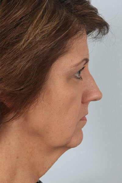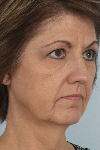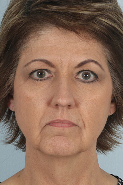 This patient in her later 50s was really bothered by the appearance of her neck and jowls. She felt no matter how much she exercised her neck wasn’t improving. The appearance of those areas made her look sad which did not go with her personality. To improve her neckline we did a neck lift, platysmal myectomy (trimmed the muscle in the area), and excised some fat on the submental area in addition to liposuction. This helped to provide that defined neckline you see in the after photo. In addition, to improve her jowls, a cheek lift was performed. Finally, to improve her lateral brow position a temporal brow lift was performed in addition to an upper eyelid skin only blepharoplasty. Taken together she has a very nice but natural final result. She is currently over 3 years out from surgery with her after photo taken at 2 months