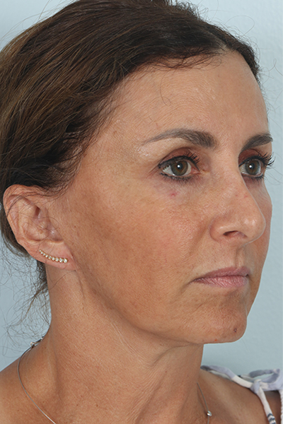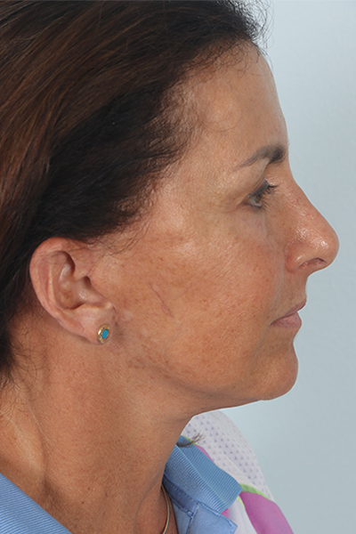 This patient in her mid-50s had a facelift elsewhere. She was bothered by the appearance of her ear(called a Pixie ear deformity) and a pleat just below her earlobe. These are both related to the techniques used by her previous surgeon. She did have a little recurrence of sagging in her neck and jowls so she wanted to see what improvement we could get. She underwent a revision check and necklift, commonly called a lower facelift. In the after photo, you can see how her earlobe now hangs in a natural position (as opposed to being pulled down on the face as a Pixie ear) and the pleat in front of her ear is gone. The jawline is also a little more defined from the lift. She is quite pleased in the after photo taken 8 months postoperatively