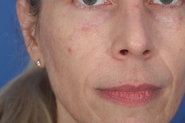 This patient in her late 40s had a history of cystic acne. Unfortunately, one of those left a deep indentation on her right cheek. In the before photo, it looks like a discolored area but that is an actual depression in the skin. She underwent fat transfer in the office under local anesthesia from her lower abdomen to her scar. In the after photo you can see the discoloration/depression is gone. She is quite happy with her result as her natural volume has been restored.
