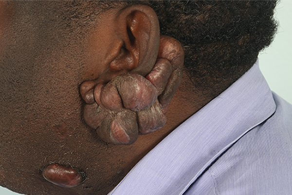 This patient had a large left ear keloid that went from the lobule and wrapped around the back. Following surgery, he underwent multiple injections of Kenalog and 5 fluorouracil to help minimize the risk of its recurrence.