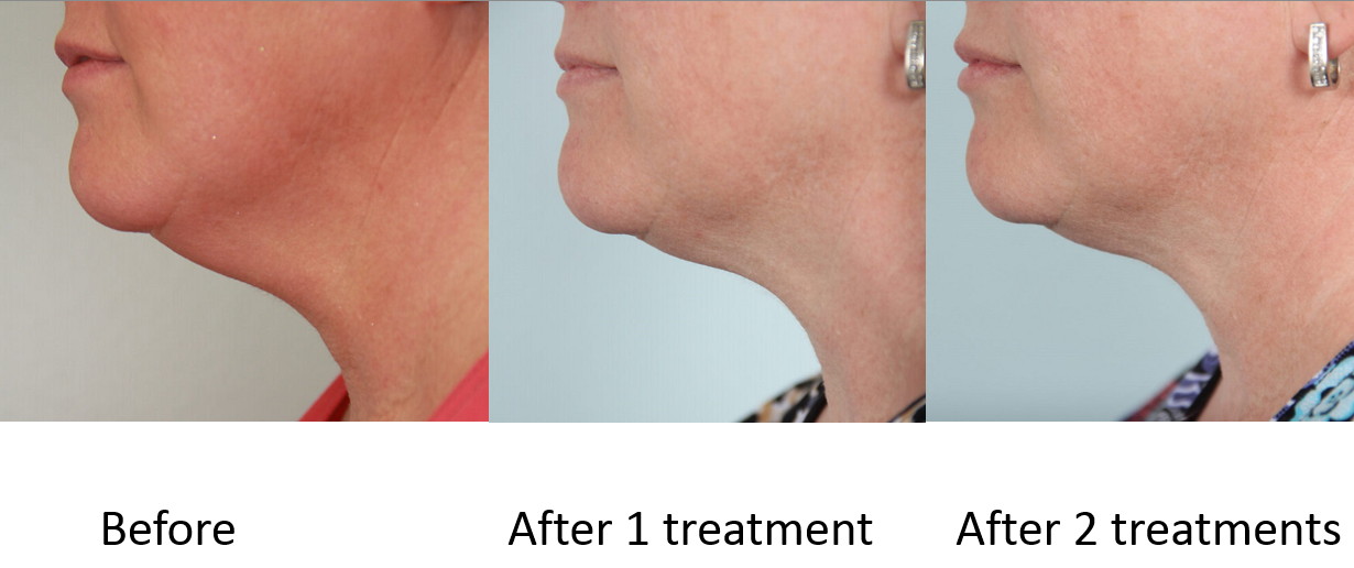 This patient in her 40s was bothered by her double chin. She wanted improvement but didn’t want any procedures performed. Therefore, she elected for Kybella. You can see the improvement in her double-chin area with several treatments of Kybella®, an injection that dissolves fat
