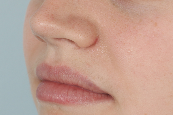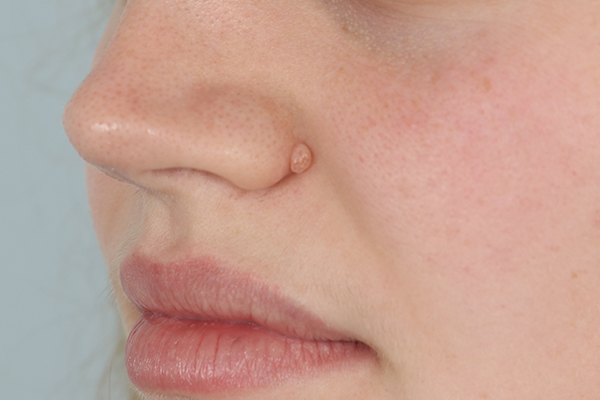 This patient in her 20s was bothered by the growth next to her nose. Dr. Guy performed a shave excision with hyfrecation. In the after photo, she is 2 weeks out. For patients with very light skin tones itis common to look this good this quickly with just a slight amount of pinkness that will also resolve.