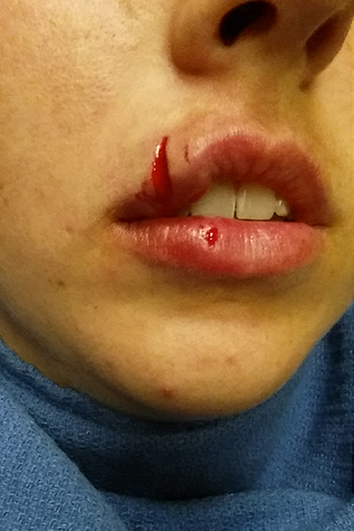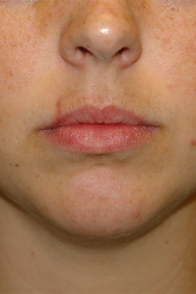 This patient had a trauma to her right upper lip. The laceration went through an important structure called the vermilion border. This is the junction between the red part of the lip and the white part of the lip above it. In the after photo, you can see how the lip margins line up nicely. The scar is still a little pink but once it turns white it will be barely visible