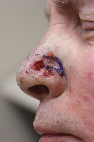 This patient in his early 60s had skin cancer on his nose. This is a very common location to get one. Because the nose skin doesn’t have much elasticity, even smaller defects can be complicated to repair. This patient had his cancer removed by a Mohs’surgeon and was referred to Dr. Guy for closure. He underwent reconstruction with what is called an island pedicle flap. In the after photo, you can see the wound remains a little pink, but the defect is completely closed and with time, the wounds will be almost imperceptible.