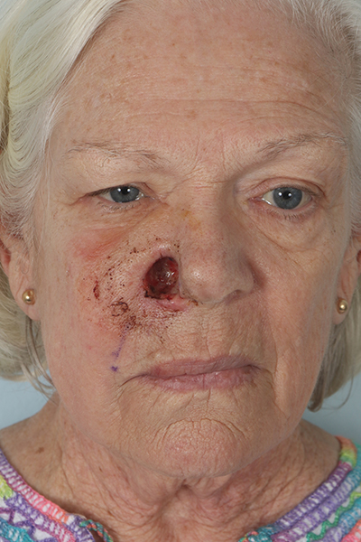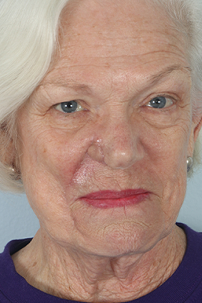 This patient in her 70s had a skin cancer removed from the right nostril area (ala) and part of her right cheek. This created a through and through defect meaning the excision of cancer went all the way through the nostril and you could see inside her nose. This required reconstruction of both the inside of the nose, the cartilage that supports the nose, and the outside lining of the nose. To accomplish this she had what is called an ipsilateral septal hinge flap (the lining of the septum was used close the inside), cartilage from her ear was used to provide support, and the outside lining was repaired with a melolabial flap (part of her cheek was used to recreate the outside of the nose). This is a two-stage procedure but in the after photo, you can see how the nose has been reconstructed and looks very normal.
