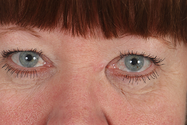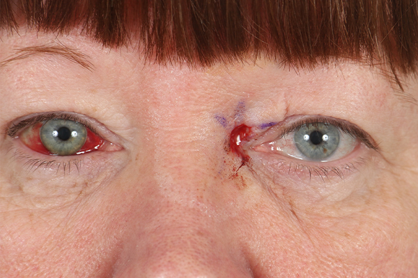 This patient in her early 50s had a basal cell skin cancer located near the inside corner of her left eye. She had it removed by a Mohs’ surgeon and then saw Dr. Guy for reconstruction. Dr. Guy was able to use rearrange the tissue in the area to close the defect and minimize the appearance of her scars.