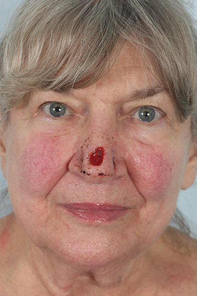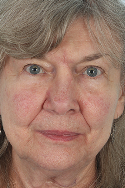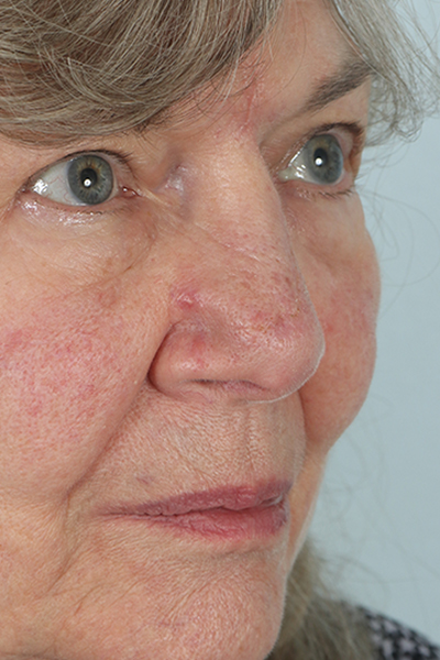 This female in her 70s had a skin cancer on the tip of her nose. She had it removed by a Mohs’surgeonand was referred to Dr. Guy for closure. Given the qualities of the skin of the nose, to close defects this size skin needs to be recruited. This patient underwent a nasal dorsal flap where skin from between the eyes and from the top of the nose is rotated down. She is 6 weeks after her surgery and doing well. You can see how well everything is healing and how minimally visible her incisions are. The added benefit of this lift is that it helps raise up the tip of the nose. This is beneficial in patients over the age of 50 as part of the natural aging process, the tip of the nose droops. She is very pleased with this reconstruction that was performed in the office.