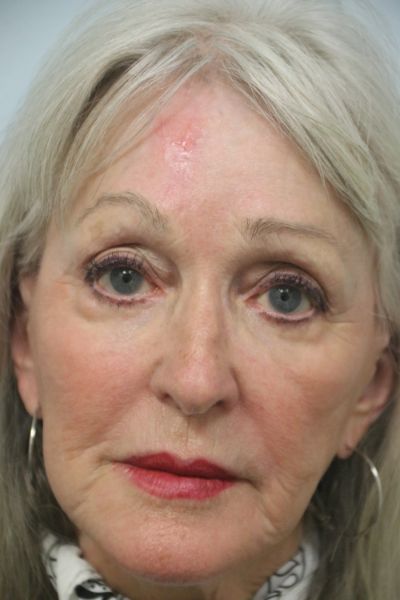 This patient in her 70s had a skin cancer removed from her forehead. Dr. Guy was able to perform a one stage procedure that avoided making the scalp numb with a procedure known as intraoperative balloon dilation. This gave her skin the flexibility to be closed leaving only the small incision noted in the after photo. The patient was ecstatic.