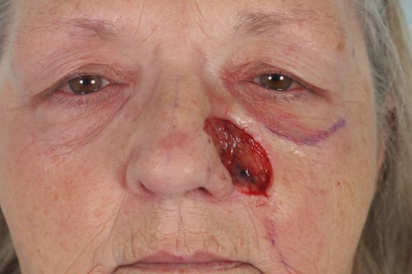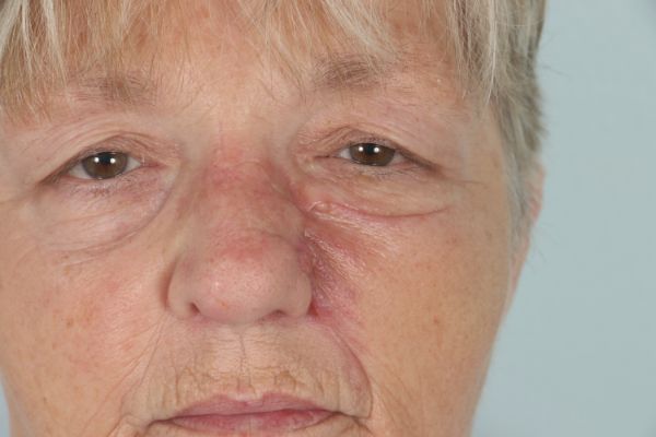 This patient had a large skin cancer removed from the left inside part of her cheek and extended onto her nose. To maintain a more natural appearance two separate reconstructions were performed at the same time. She had a bilobed flap reconstruction on the nose connected to a cervicofacial flap (cheek advancement flap) from her left cheek. In the after photo she is 2 months out from surgery. The incisions are still pink but this very large defect was closed in a single setting.