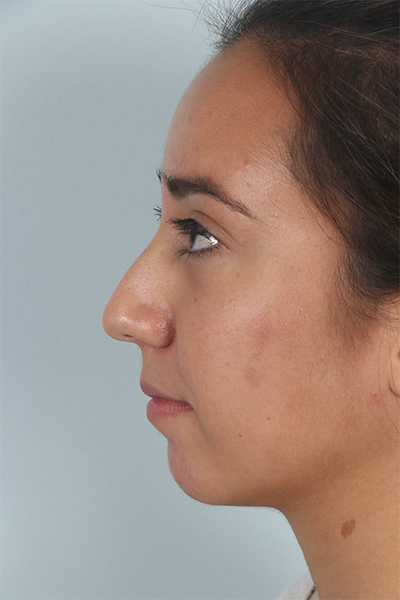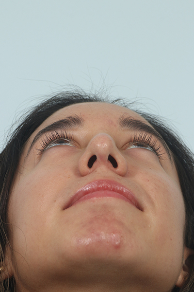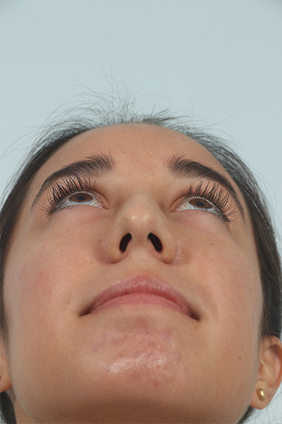This patient in her 20s was bothered by her hump and tip width. She wanted refinement of both. Dr. Guy took down a 2.25 mm dorsal hump, placed a left spreader graft for nasal support, refined the tip with intra and interdomal sutures, deprojected the nose slightly with a complete transfixion incision, and performed lateral osteotomies to close an open roof. In the after photo you can see how her side profile no longer shows a hump and how her tip is narrowed from the worm’s eye view.