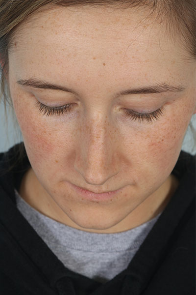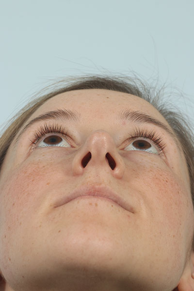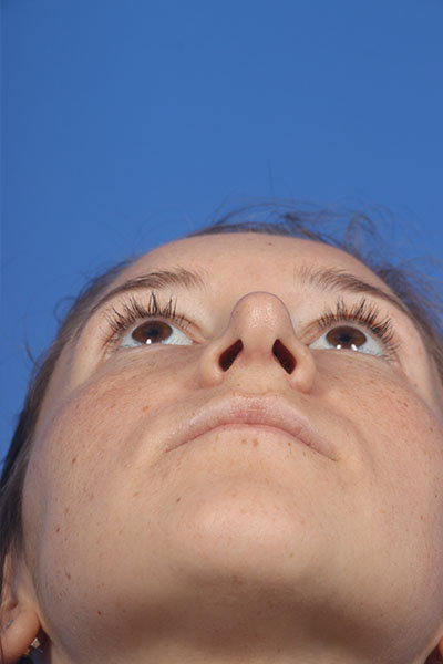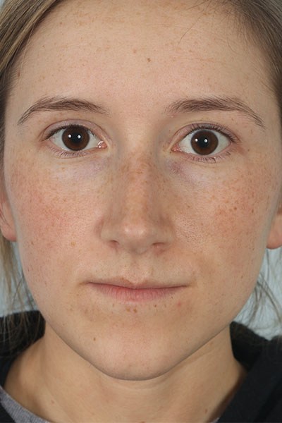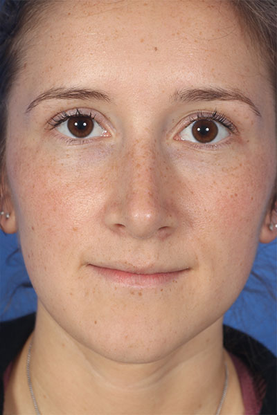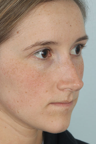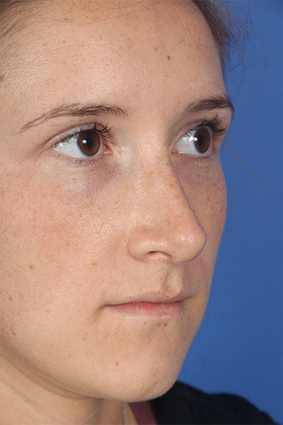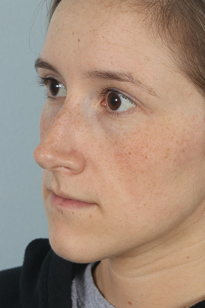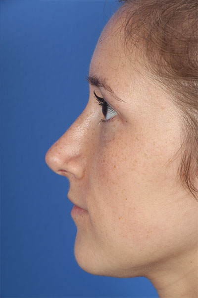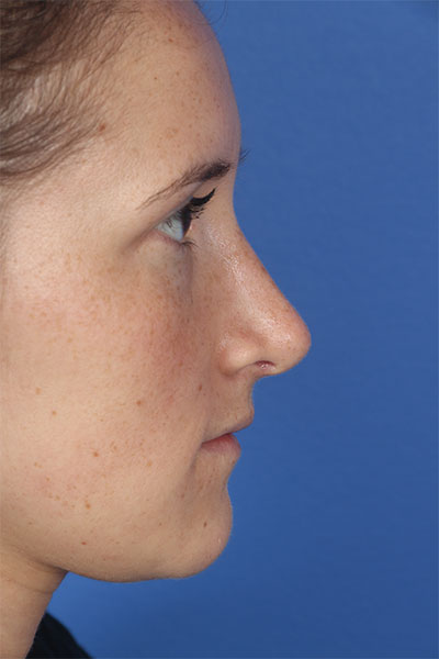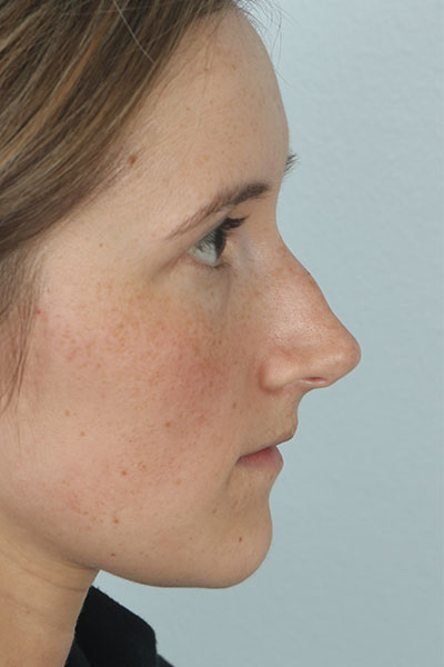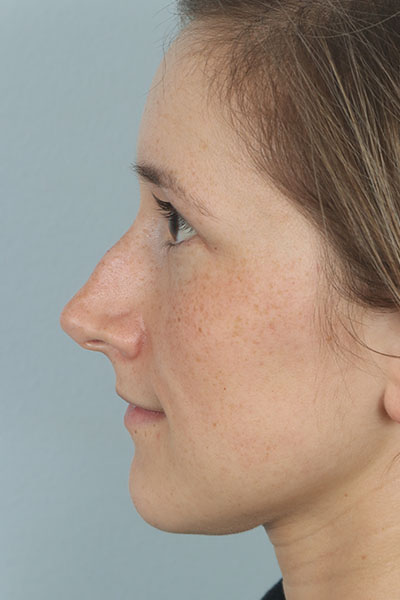 This patient in her mid 20s was bothered by her dorsal hump. On exam she has a classic tension nose. She underwent a 2.25 mm dorsal hump removal, complete transfixion incision to help deproject the nose, trimming of the anterior and posterior septal angles and the nasal spine, and lateral osteotomies. In the after photo you can see a more feminine profile.