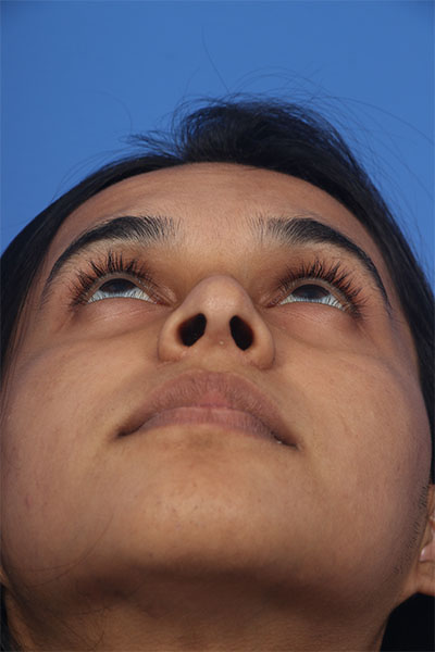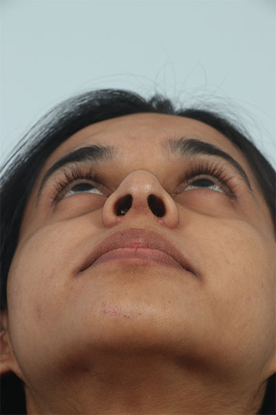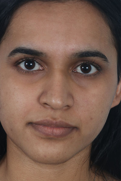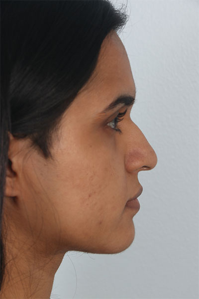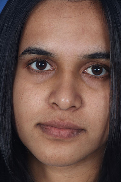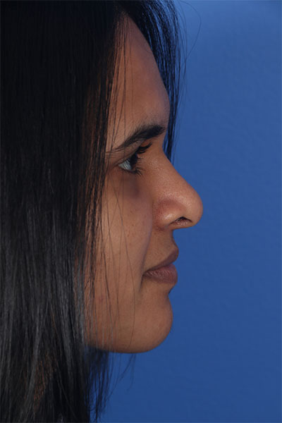 This patient in her 20s was bothered by the width of her nose and her dorsal hump. Dr. Guy performed a hump reduction of 2 mm, trimmed the width of her upper lateral cartilages on her dorsum to narrow the dorsum of the nose, and performed Weir incisions to narrow the base and lateral osteotomies to narrow the width of the nose. In the after photo you can see how her nose has been narrowed but still looks natural.