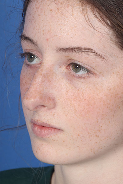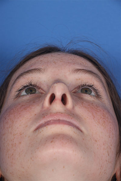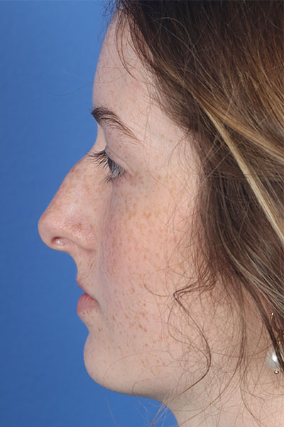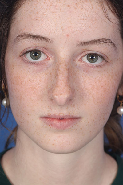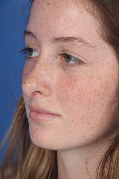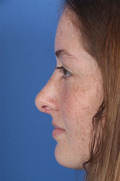 This patient in her teens was bothered by her hump on her nose and the width of her tip. In addition, she had functional issues with breathing both from a deviated septum and collapse of the lateral nasal walls when she breathed in. Dr. Guy performed a rhinoplasty including removing a dorsal hump, trimming of the caudal septum to elevate her hanging columella, and INTRA and INTERdomal sutures to narrow the tip. From a functional standpoint she had a septoplasty and placement of bilateral alar batten grafts to support her nasal sidewalls. In the after photo, she cannot control her smile as she is so happy. What you can appreciate is the hump is gone, the tip is narrower, and the columella is in a better position. Her breathing is also excellent.