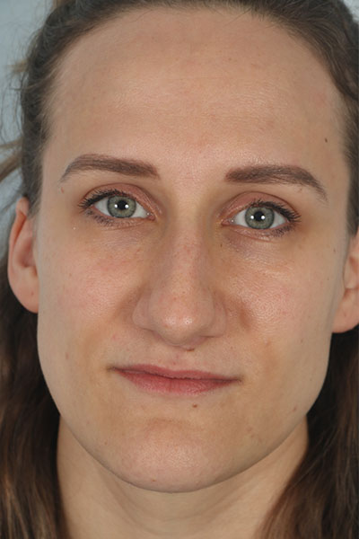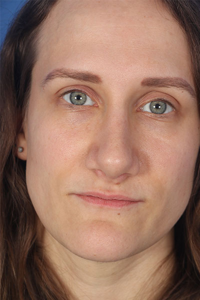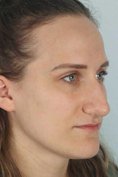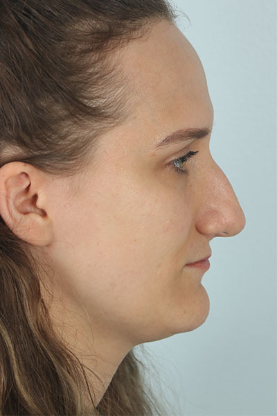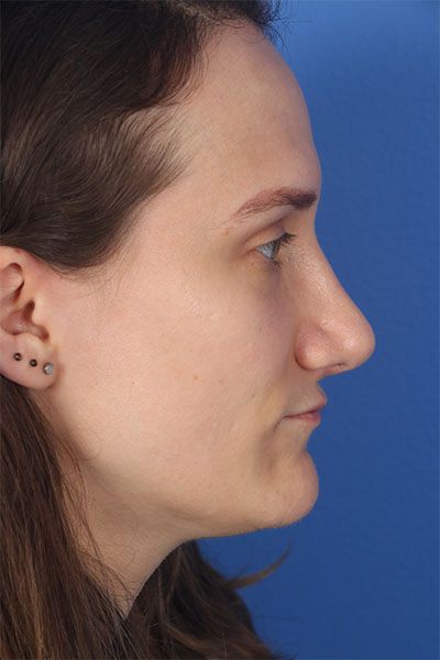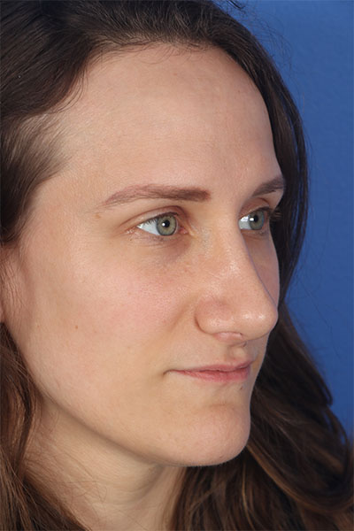 This patient in her 30s was bothered by the hump on her nose, the droopiness of her nose, and the width of her nasal tip. Dr. Guy performed a rhinoplasty including a tongue in groove to lift the nose, cephalic trim with INTRA and INTERdomal sutures to narrow the tip, a dorsal hump removal, and lateral osteotomies to narrow the width of the nose. She loves her new feminine nose.