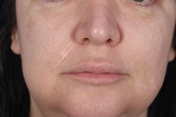 This patient had a bite to her right cheek/melolabial fold about 8 months prior to presenting for scar revision. Dr. Guy excised her scar and placed the incision directly into her right melolabial fold. Although her incision is still a little pink, this will resolve with time. In the after photo you can see how much improvement she has had in her scar.